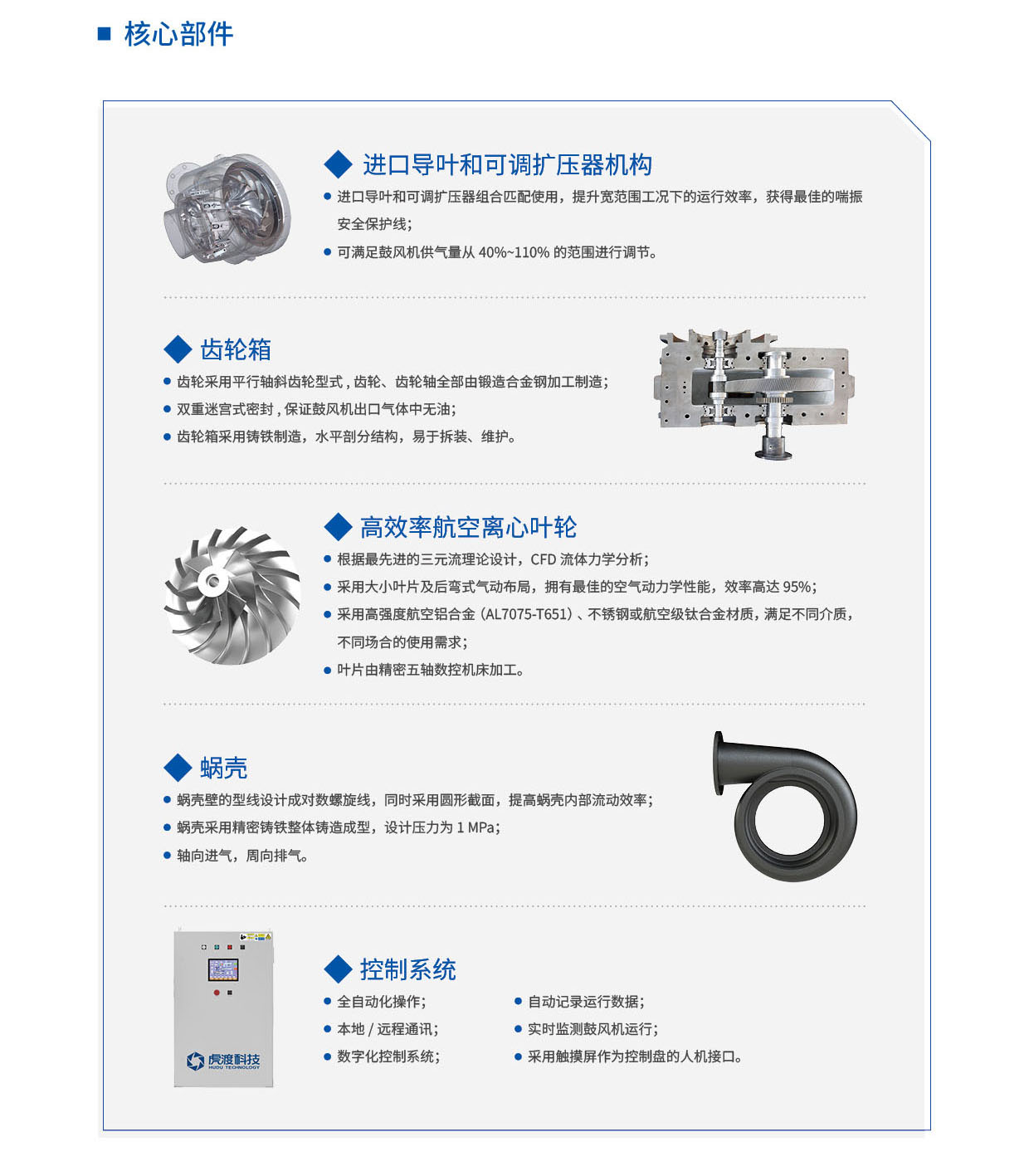 虎渡科技自主研发单级高速离心鼓风机,采用电机驱动,高速齿轮箱增速,匹配虎渡高性能叶轮。依托超高效的产品设计,匠心打造风机领域高端设备。单级高速离心鼓风机采用先进的三元流技术设计,气动效率达95%,匹配进出口导叶联动调节,工作范围40-110%。其主要特点是高效节能、高度自动化集成化、稳定性好、安装维护方便,广泛应用于污水处理、发酵、冶金、造纸、脱硫脱硝以及气体输送等领域。